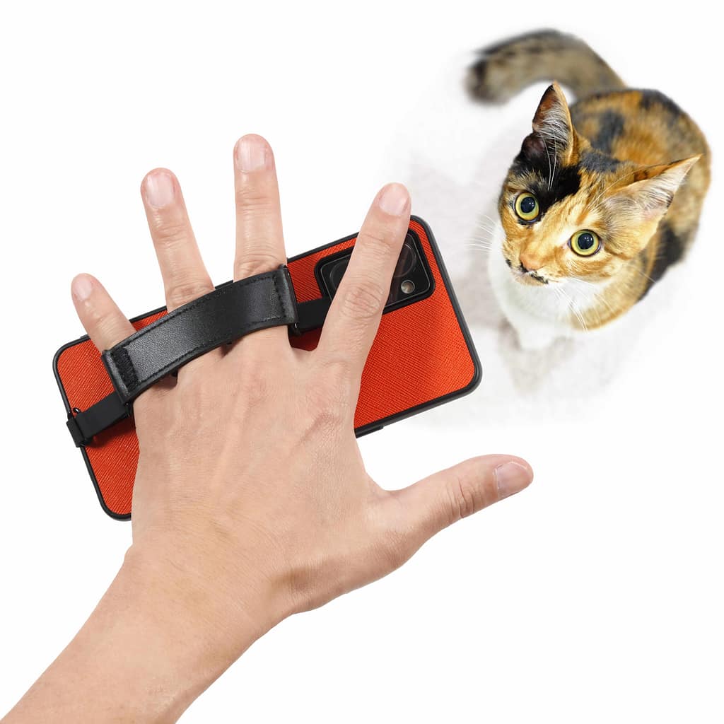 「1.スマホケースに接続するゴム」と「2.手を保持するためのバンド」とを構造的に分ける特許技術により、はじめて生まれた使い心地です。