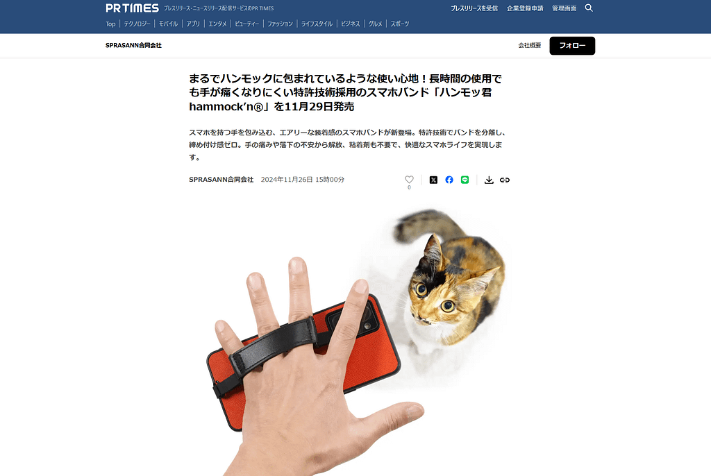 【ニュースリリース】まるでハンモックに包まれているような使い心地!長時間の使用でも手が痛くなりにくい特許技術採用のスマホバンド「ハンモッ君 hammock’n®」を11月29日発売