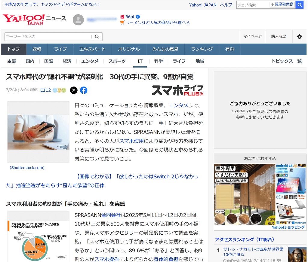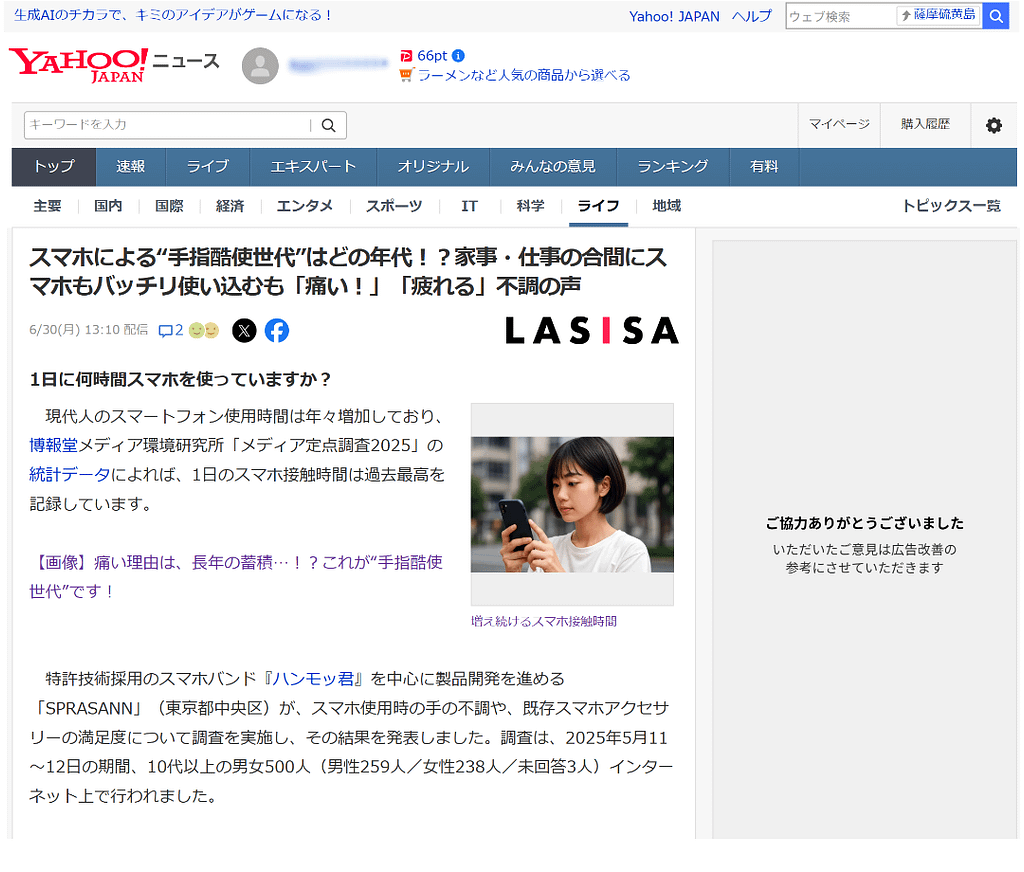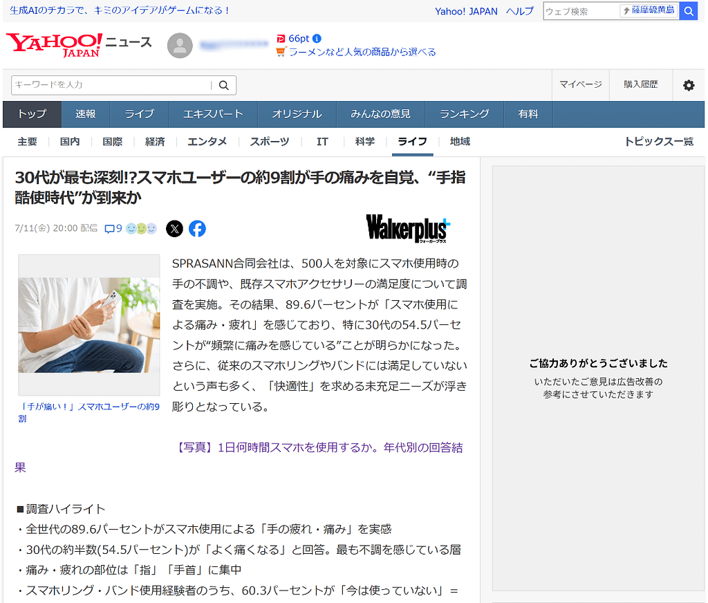 【ニュースリリース】「手が痛い!」スマホユーザーの約9割。 30代が最も深刻。“無言の不調”が無視できない規模で明らかに。